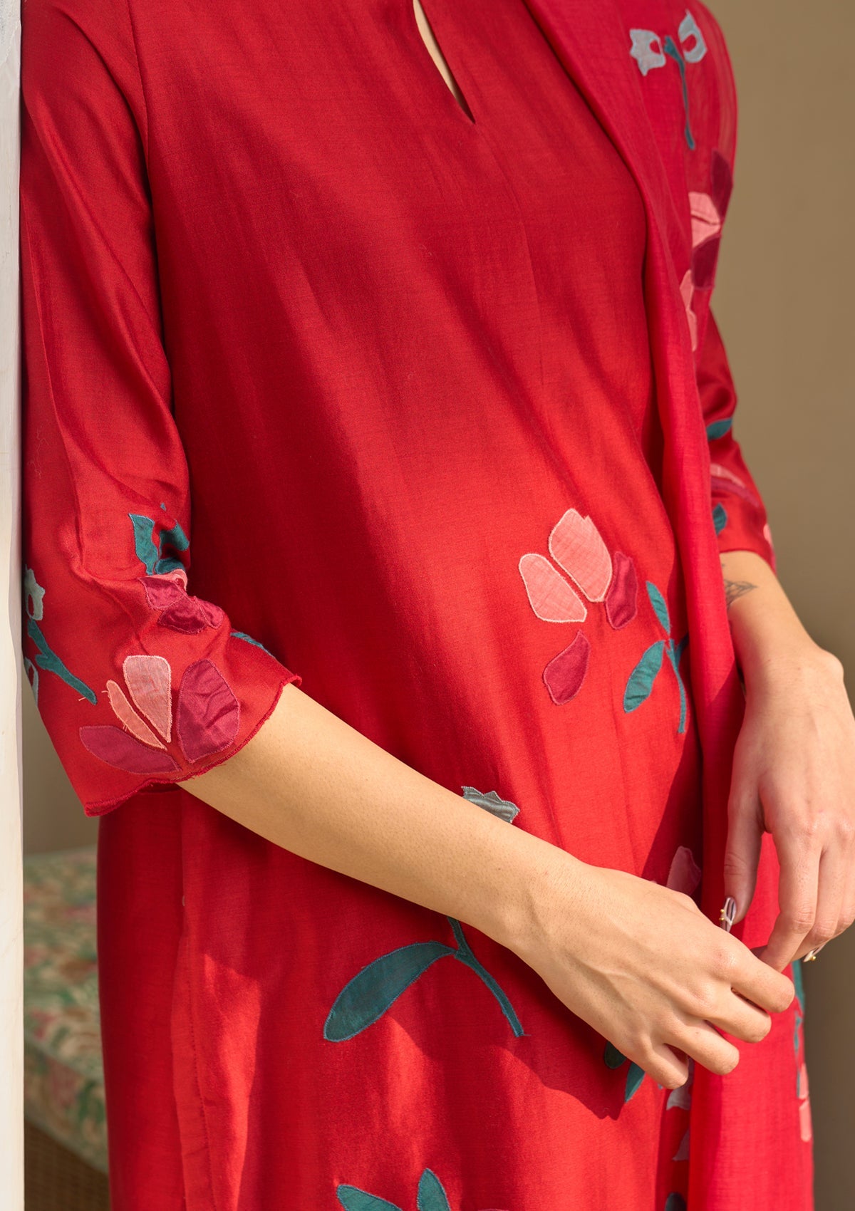 The Cherry Red Applique Kurta Set is adorned with delicately placed applique blooms across the kurta. The ensemble is completed with coordinating pants and a dupatta embellished with matching applique motifs and our signature tassels, adding a refined, seasonal finish.Garment Details:Giza SilkAppliqueDry Clean onlyLength 47.5"Size and Fit:Comfort FitModel is 5’8...