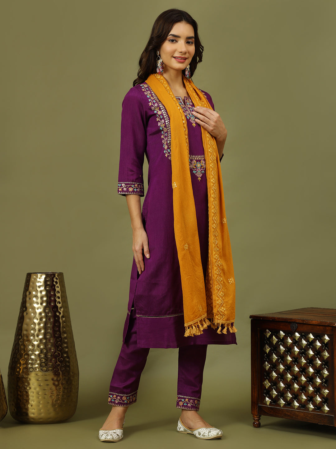 Crafted from luxurious polyester, this elegant purple kurta set is designed to bring together refined craftsmanship and graceful style. Delicate floral embroidery adds a touch of sophistication, making this ensemble a perfect choice for festive and formal occasions. The kurta features a flattering V-neckline and 3/4 sleeves, creating a tailored...