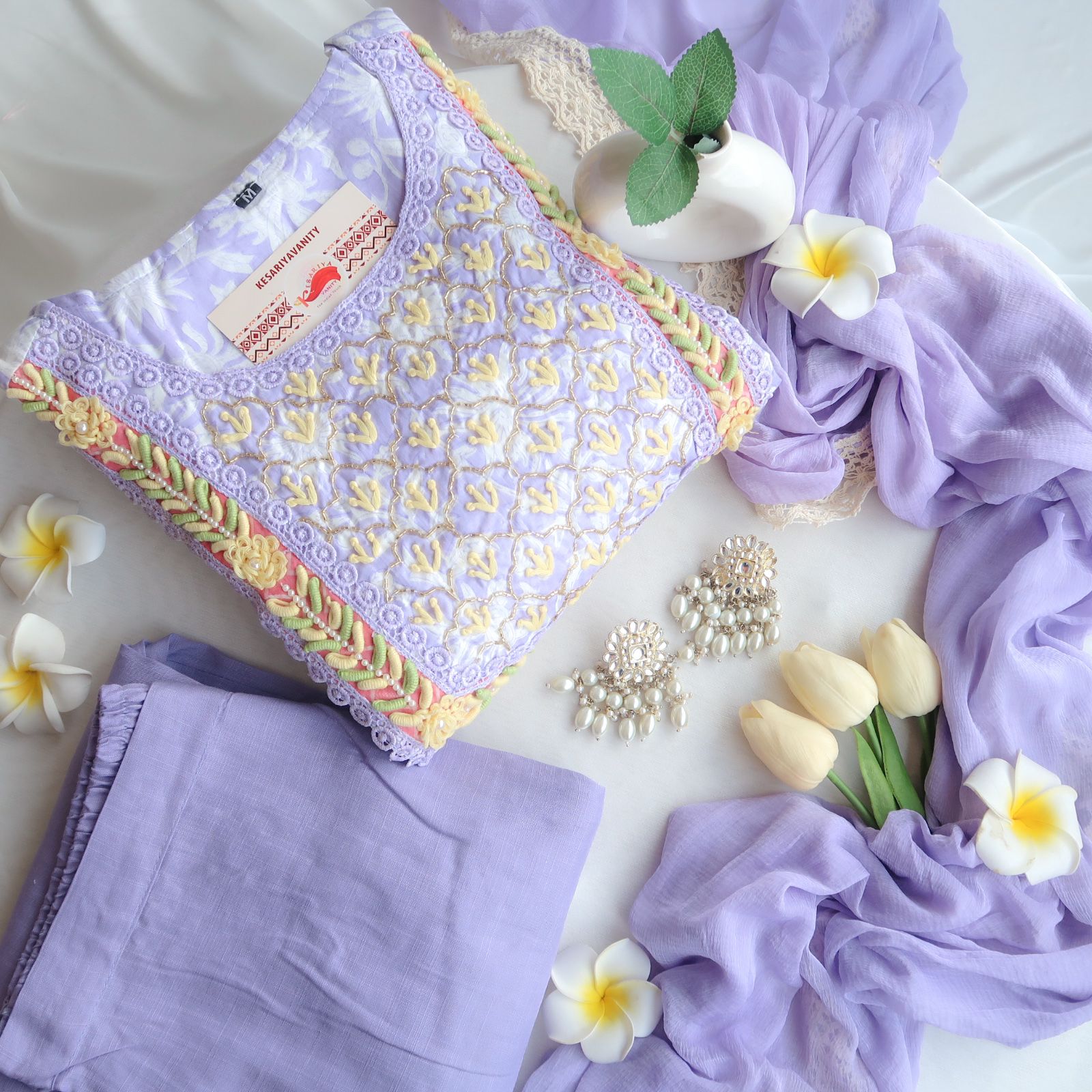 Introducing our exquisite Three-Piece Anarkali Suit Set in a serene lavender base, perfect for making a statement with elegance. The Anarkali kurta features a classic round neck and 3/4 sleeves, adorned with intricate, heavy embroidery throughout, giving it a luxurious and regal feel. Paired with plain lavender straight-cut pants, the...