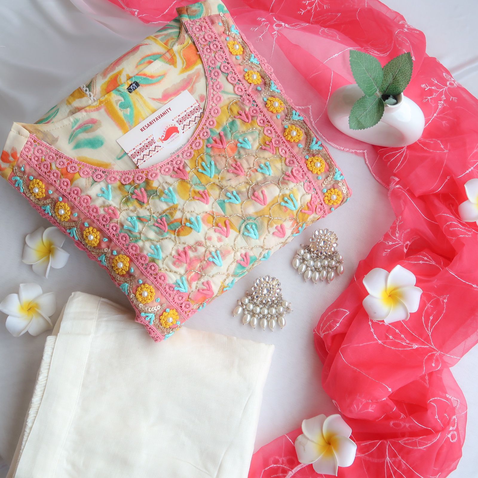 Introducing our vibrant Three-Piece Anarkali Suit Setq in a stunning multicolor pastel base, perfect for those who love to blend tradition with modern hues. The Anarkali kurta features a round neck and 3/4 sleeves, adorned with intricate and heavy embroidery throughout, making it a true statement piece. Paired with sleek...