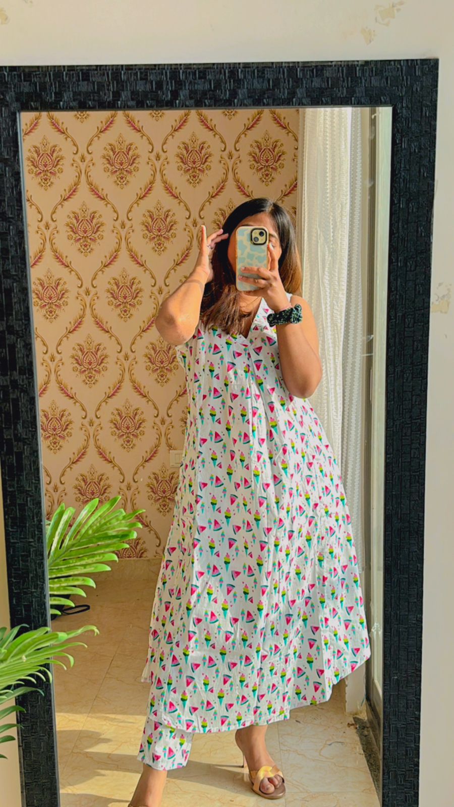 Introducing our delightful White Summer Treats Cotton Kurta Pants Set, where sweetness meets style! The kurta features a fresh white base adorned with charming small ice cream and watermelon prints, adding a playful and refreshing touch to your ensemble. Its sleeveless design and elegant V-neckline exude modern sophistication, while the...